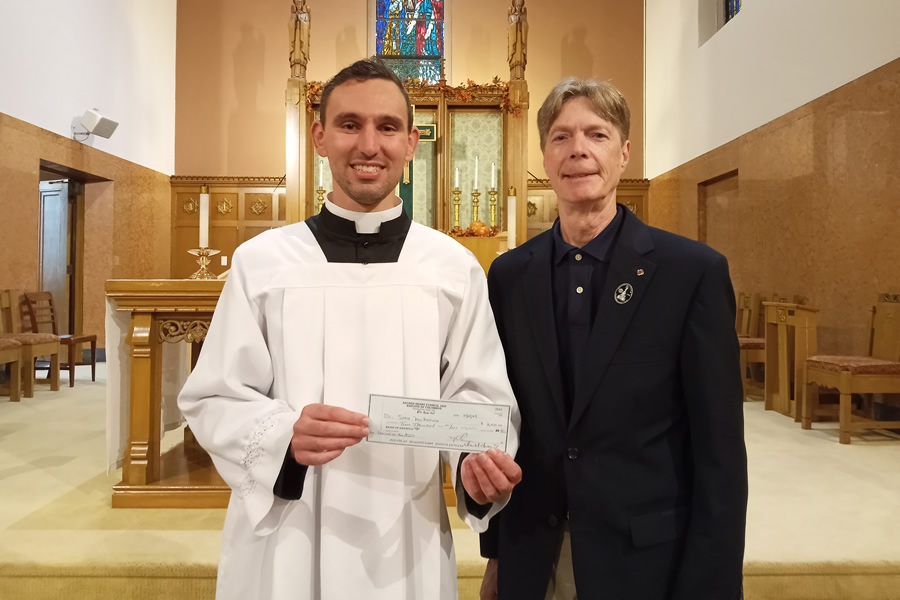 As the strong right arm of the church, Knights of Columbus is committed to providing moral, financial, and spiritual support to our future priests and religious at all stages of their formation. The Franklin Knights present a donation to seminarian Sean McKeown for support of his formation.